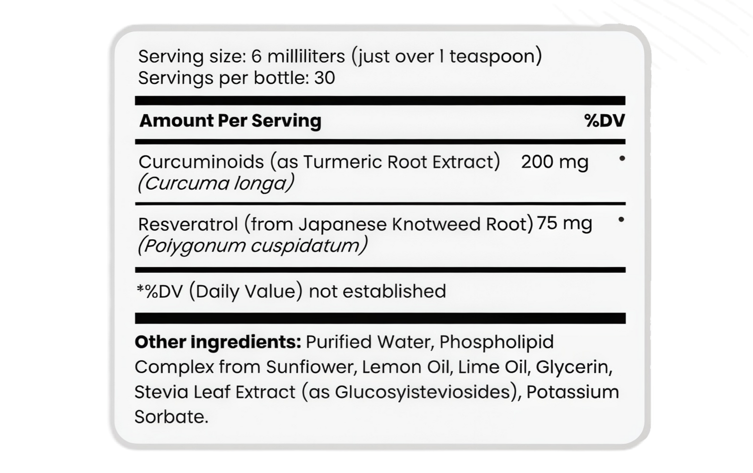 This liposomal formula delivers Curcumin and Resveratrol, two well-studied antioxidants that help support a healthy inflammatory response, promote cellular health, and protect against oxidative stress. This powerful duo supports joint function, healthy aging, and overall wellness so you can feel your best every day.*